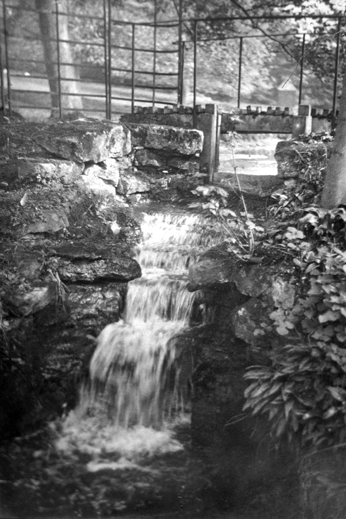 © CKLHSSluice, main waterfall and footbridge. A livestock fence on Lilley Brook