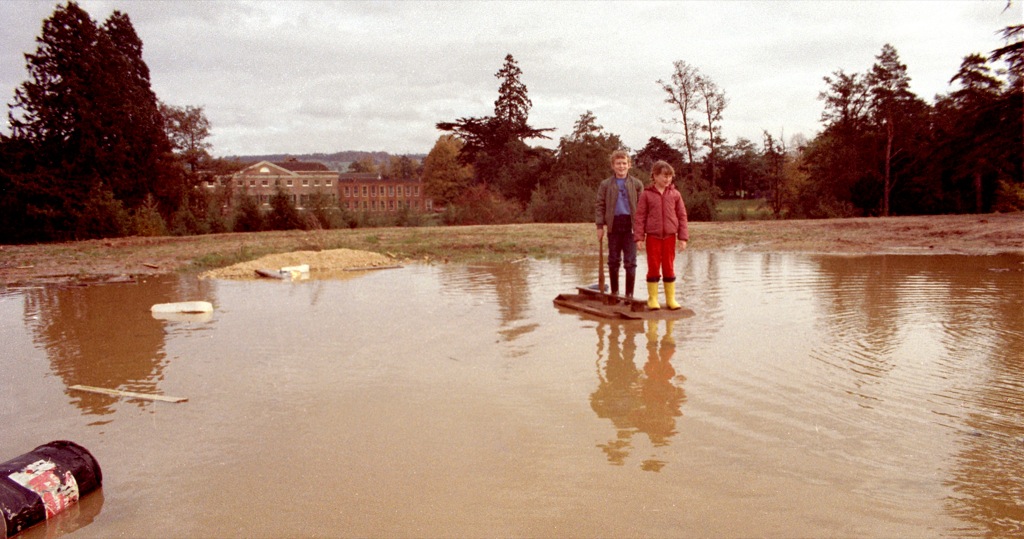 In 1983 children enjoy a temporary water-park, with Charlton Park Convent in the background