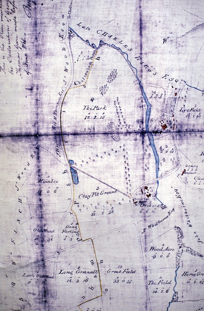 The 1811 estate map of Charlton Park (72 acres) with the mansion shown as a red block, upper right.