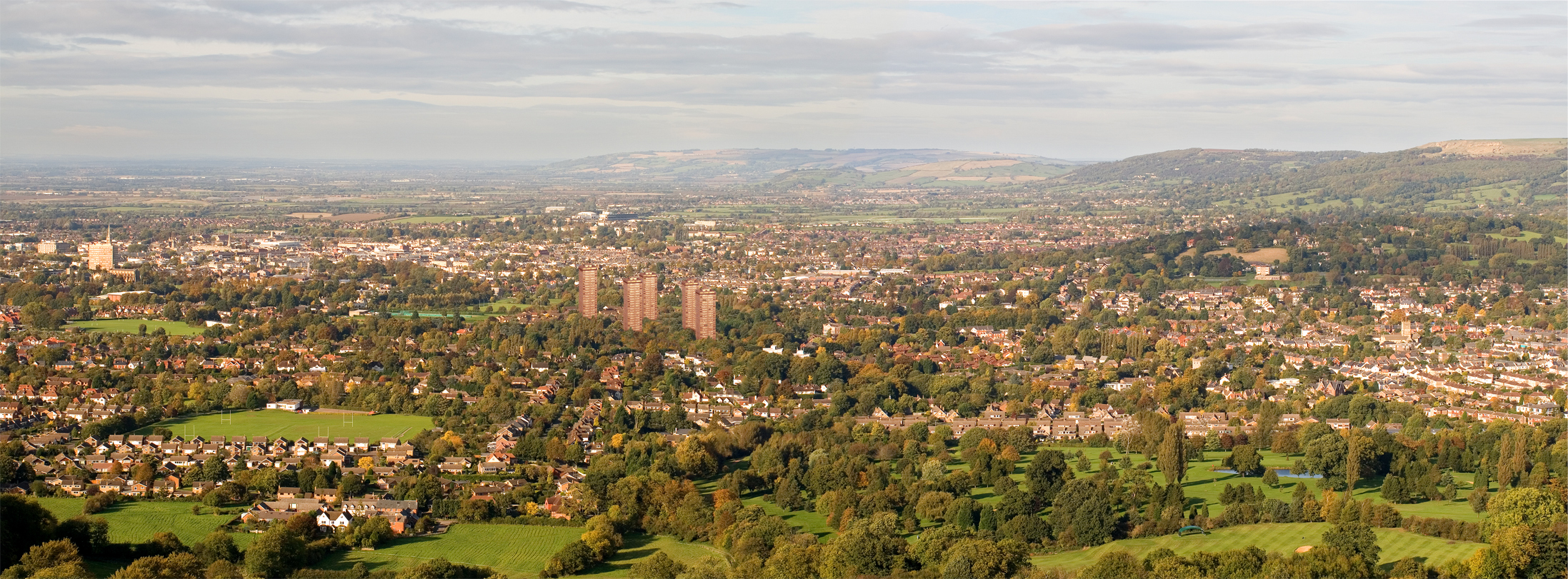 Fortunately Cheltenham entered the third millennia a predominatly low-rise attractive town, and not as things could have looked had this photographic impression of 1960s plans become reality. From this uniquely attractive viewpoint on Charlton Kings Common, (part of the Cotswold escarpment) the outlook across the town and Severn Vale has been enjoyed for centuries. The foreground remains the jewel in the crown as it continues to host most of the Georgian and Regency architecture Cheltenham is still renowned for. Beyond the town is the famous Prestbury Park Racecourse, overlooked by Cleeve Hill, (its own lengthy history including the Iron Age hill-fort of two thousand years ago and the venue for Cheltenham's first Gold Cup flat race in 1819). Beyond this is Nottingham Hill, Oxenton Hill, Tewkesbury, the River Severn (Britain's longest river) and some of the prettiest villages to be seen in the country, spread out neatly across the vale towards its much older Malvern Hills backdrop.