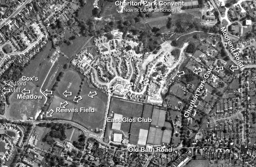 Arrows indicate the approximate route of the pre-1780s 'Old London Road' from Sandy Lane/Moorend Road on the right of this 1982 aerial photograph across Charlton Park to Old Bath Road and Sandford Mill on the left.